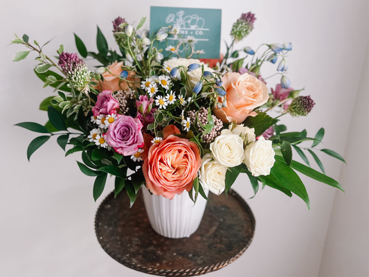 Welcome to Blooms + Co., your neighborhood boutique florist from East Cobb/Marietta, GA. We serve several North Atlanta areas including East Cobb, Marietta, Roswell, Sandy Springs, Kennesaw, Smyrna, Vinings, Woodstock and other select locations. Our arrangements are garden style with a bit of rustic and romantic touches. We currently offer seasonal bouquets, centerpieces, and locally-sourced gifts that we deliver daily. If you’re needing an arrangement to decorate your home, or sending a bouquet to someone to brighten their day, you’ve come to the right place. Varieties change monthly and seasonally. And, as we continue to bloom, look out for more offerings to become available! We love custom orders, so reach out if you like our style but don't see exactly what you're looking for on our site.