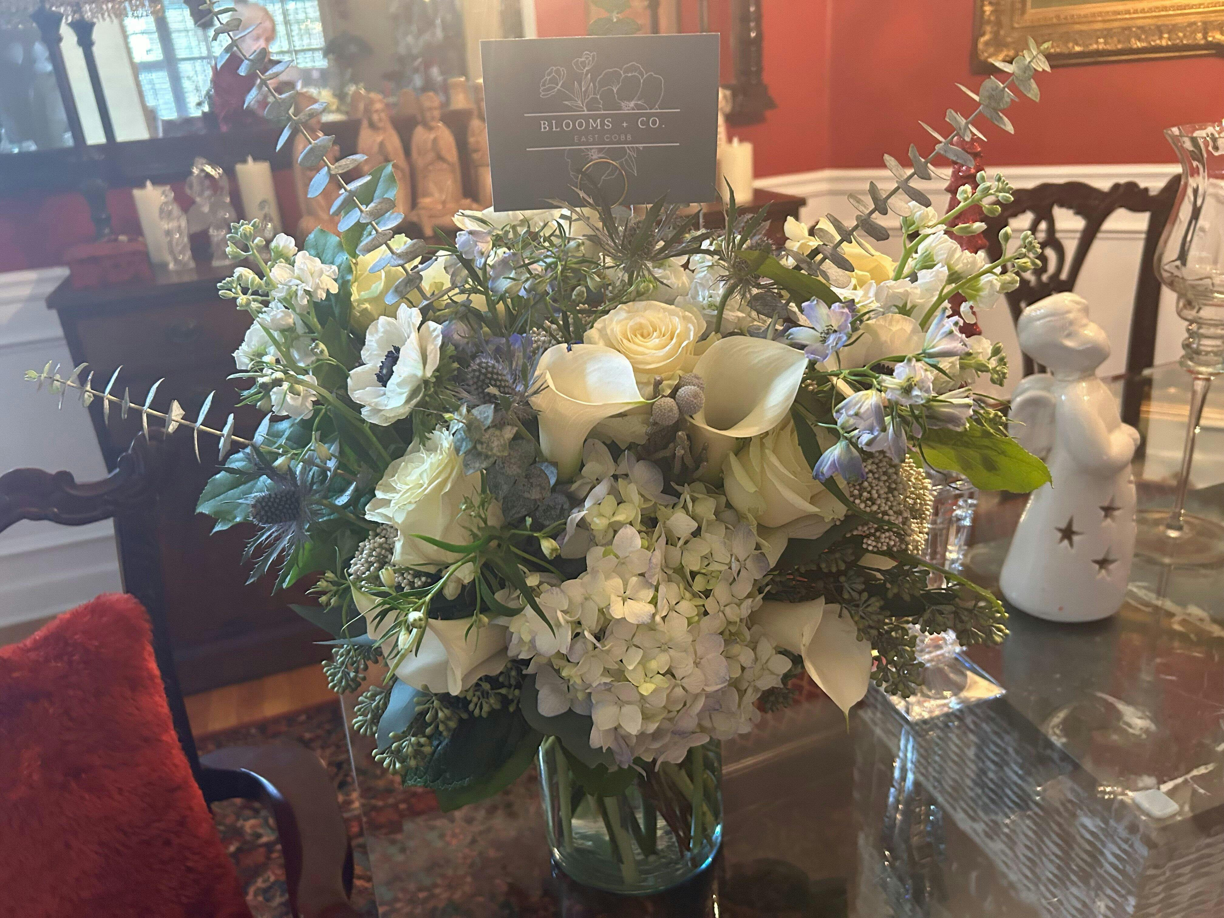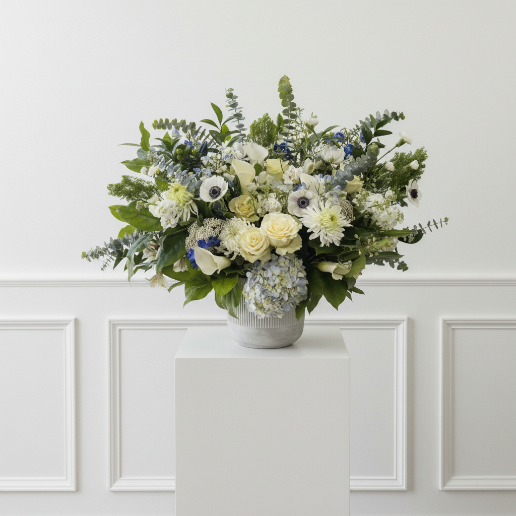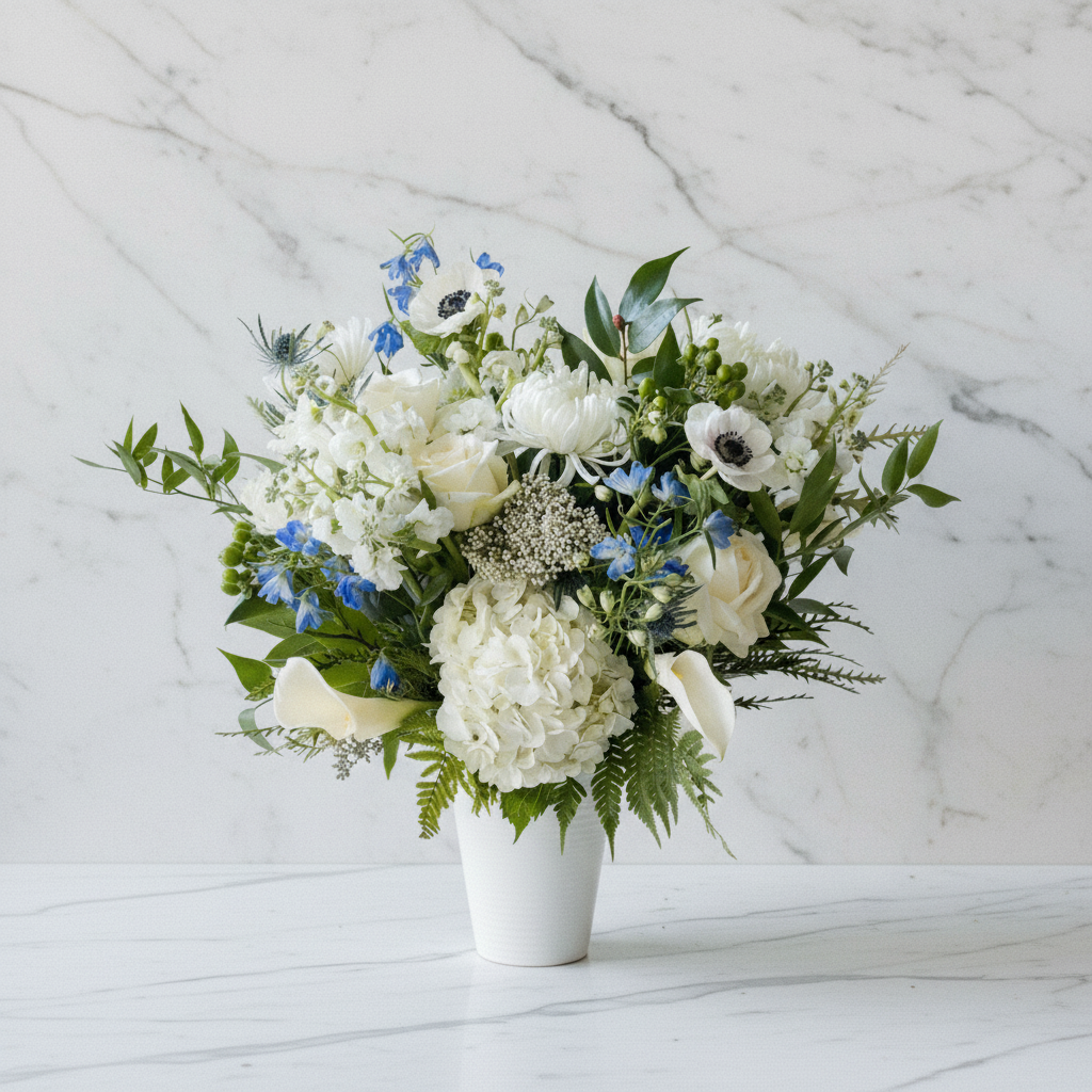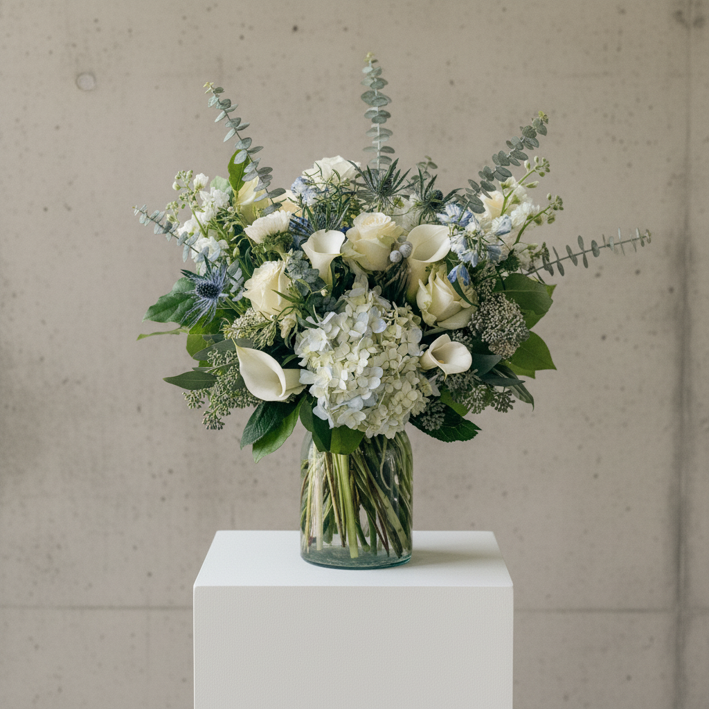 A radiant blend of crisp whites and luminous blues, Frost + Blue captures the joyful spirit of winter with a modern, elegant touch. Soft seasonal textures and cool tones come together to create an arrangement that feels bright, meaningful, and beautifully celebratory.