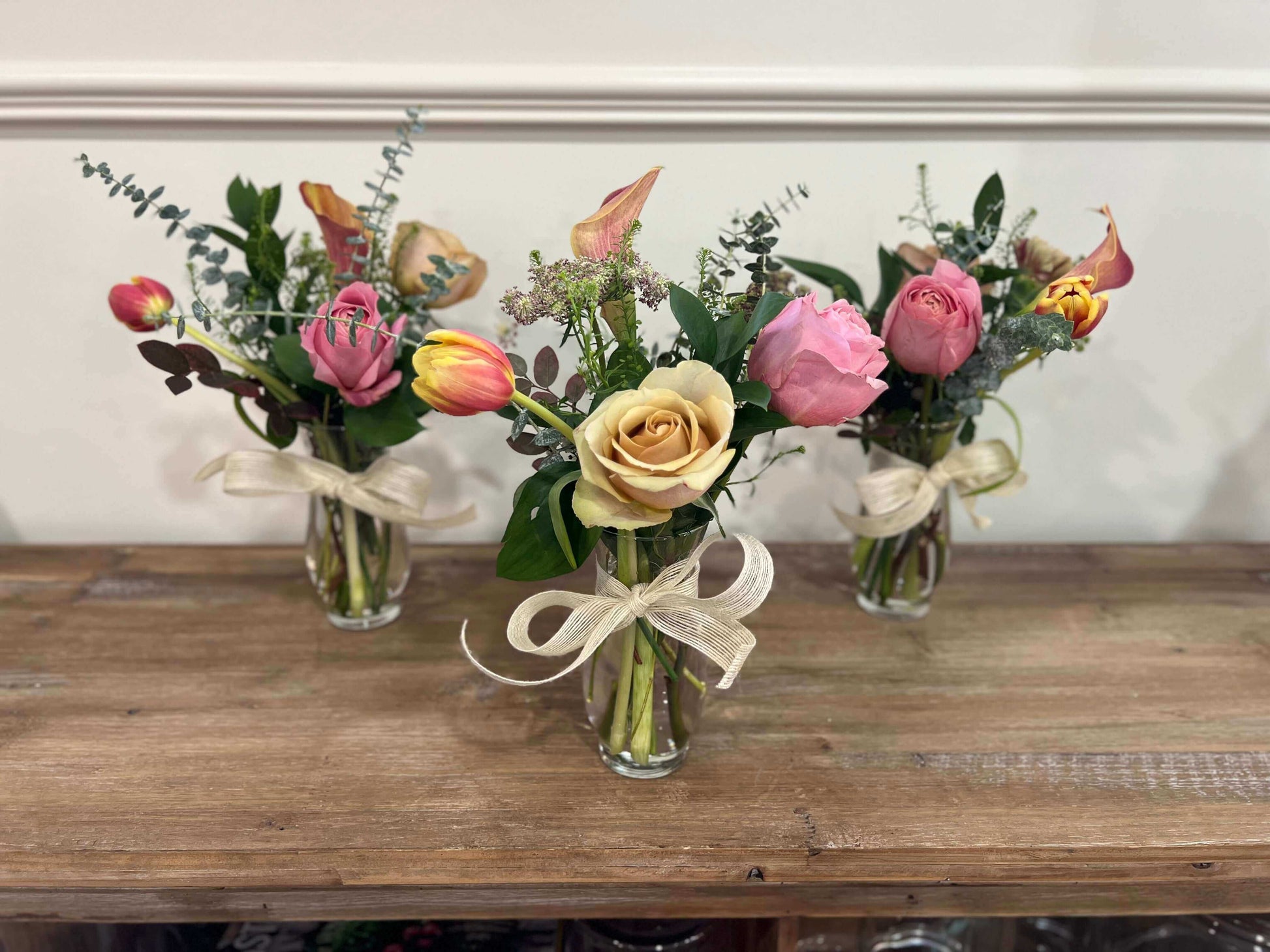 Bud vases of varying sizes and heights containing 3-5 stems each in a soft palette, consisting of mostly pastels. A new take on a floral arrangement, you can either choose individual vases or a trio. Group them together or separate them down the center of a table for beautiful and modern wedding arrangements.