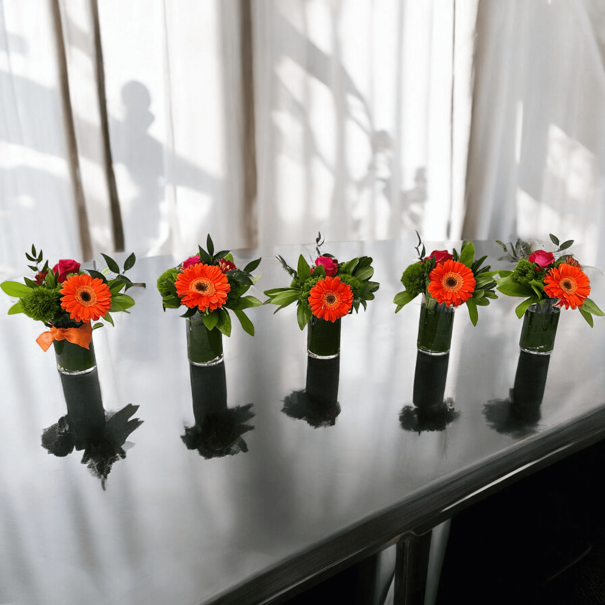Bud vases of varying sizes and heights containing 3-5 stems each in a colorful palette, consisting of mostly bold colors. A new take on a floral arrangement, you can either choose individual vases or a trio. Group them together or separate them down the center of a table for beautiful and modern wedding arrangements.
